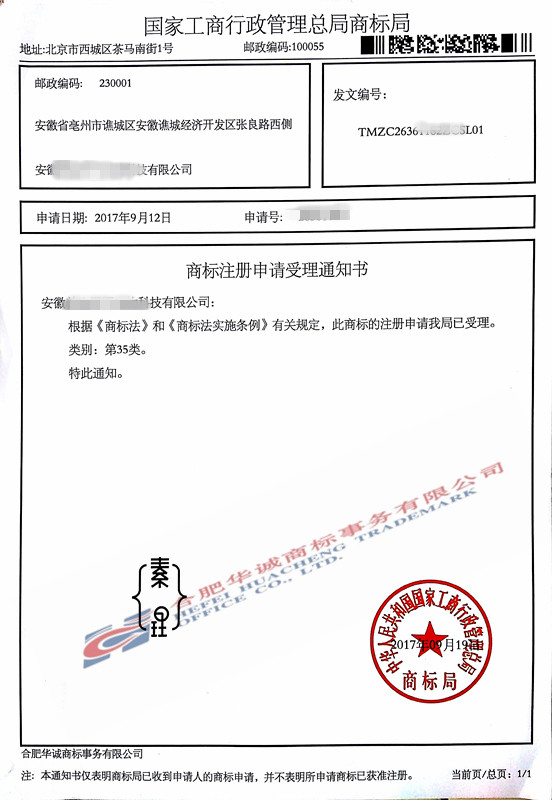 您委托我所代理商标注册申请,名称为“素理”5、30、32、35类商标已被国家商标局受理。