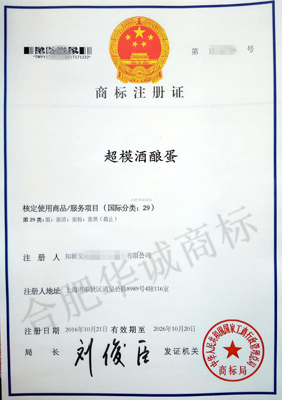 您委托我所代理商标注册申请,名称为“超模酒酿蛋” 29类商标注册证已下达。