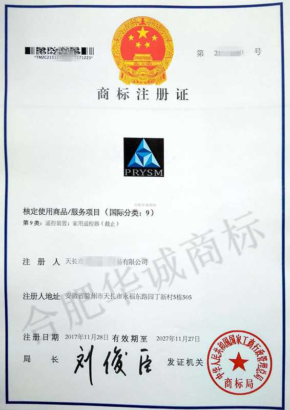 您委托我所代理商标注册申请,名称为“PRYSM” 9类商标注册证已下达。