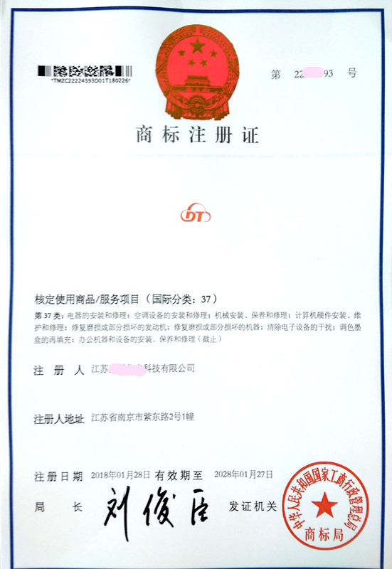 您委托我所代理商标注册申请,名称为“DT” 37类商标注册证已下达。