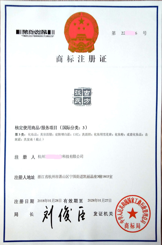 您委托我所代理商标注册申请,名称为“谈氏古方” 3类商标注册证已下达。