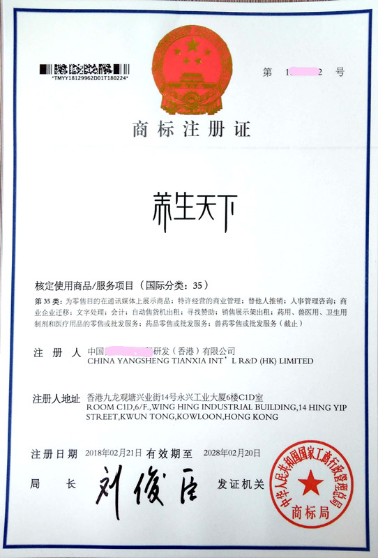 您委托我所代理商标注册申请,名称为“养生天下” 35类商标注册证已下达。