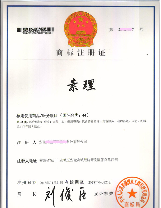 您委托我所代理商标注册申请,名称为“素理”44类商标注册证已下达。