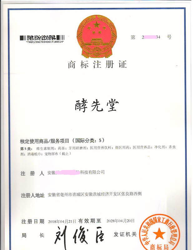 “酵先堂”5类商标注册证下达