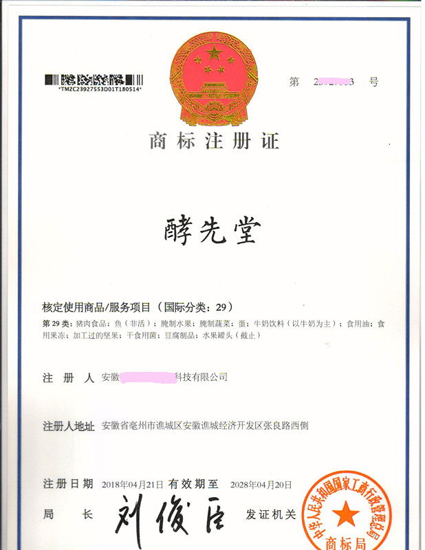 您委托我所代理商标注册申请,名称为“酵先堂”29类商标注册证已下达。
