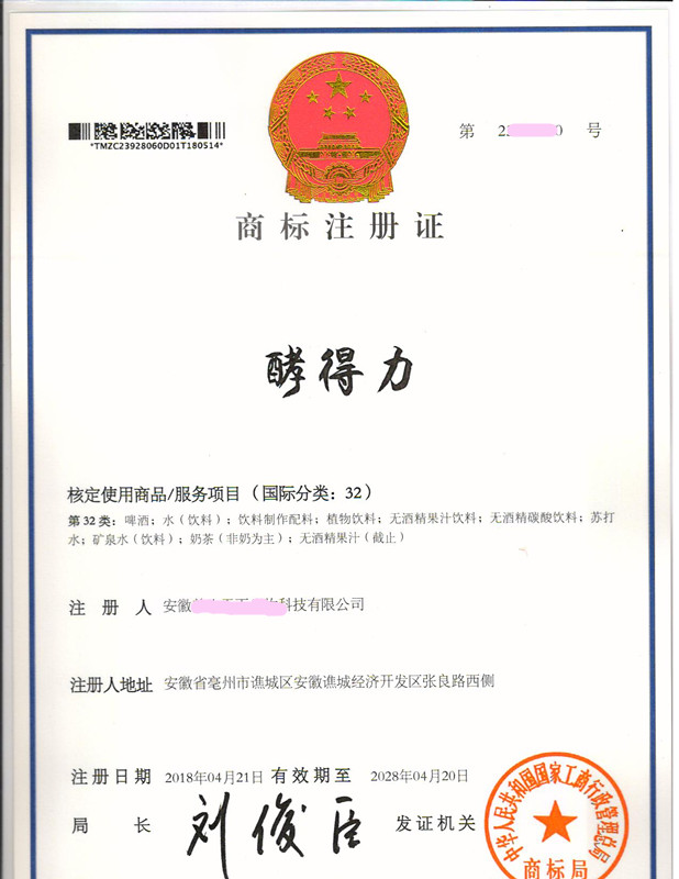 “酵得力”32类商标注册证下达