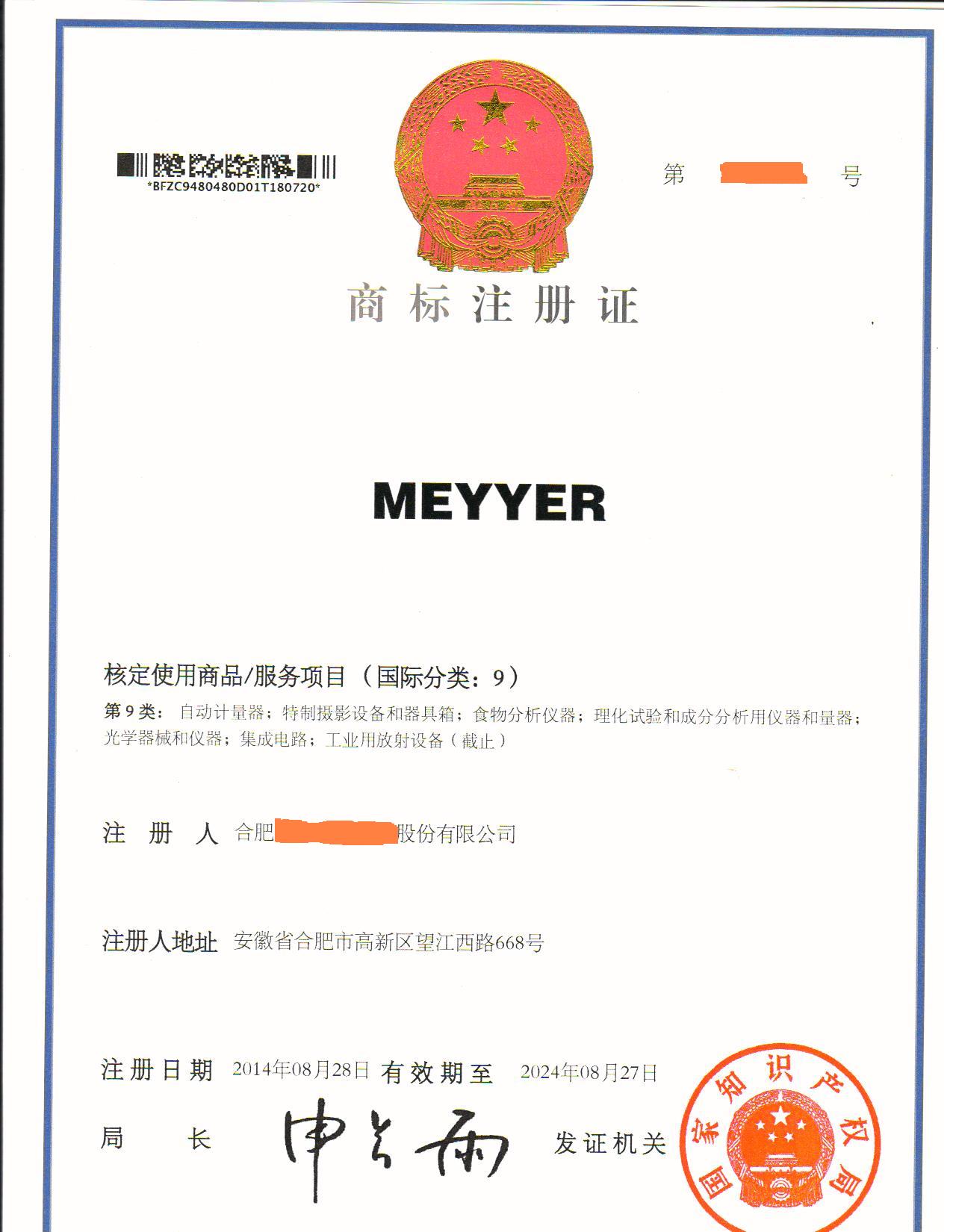 “MEYYER”9类商标注册证下达