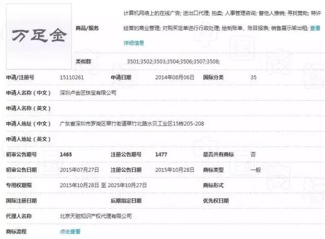 商标局共有18个“万足金”商标,除了深圳卢金匠珠宝有限公司名下的3个第35类“万足金”商标。大部分的“万足金”商标均为第14类(珠宝饰品)。